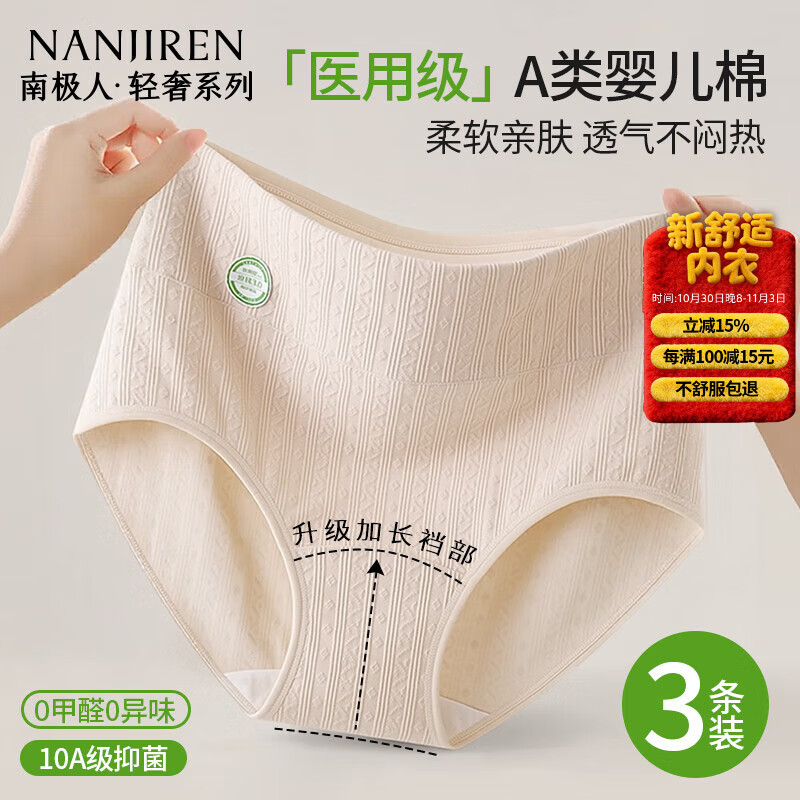 南极人10A抑菌医用级纯棉女士内裤女高腰收腹加长裆新款三角内裤3条L