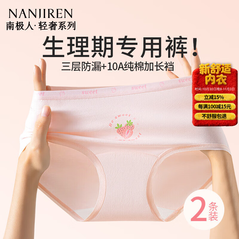 南极人(Nanjiren)女士内裤生理内裤女月经姨妈神器三层防侧漏少女中腰三角裤2条L