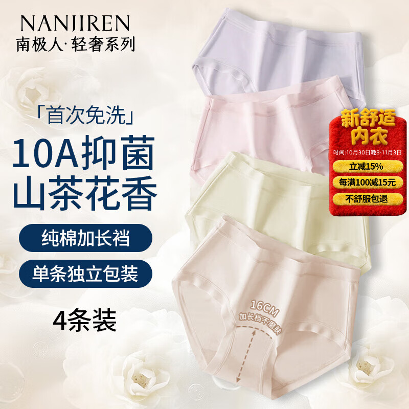 南极人免洗即穿纯棉女士内裤女山茶花中腰10A抗菌加长裆三角裤4条L
