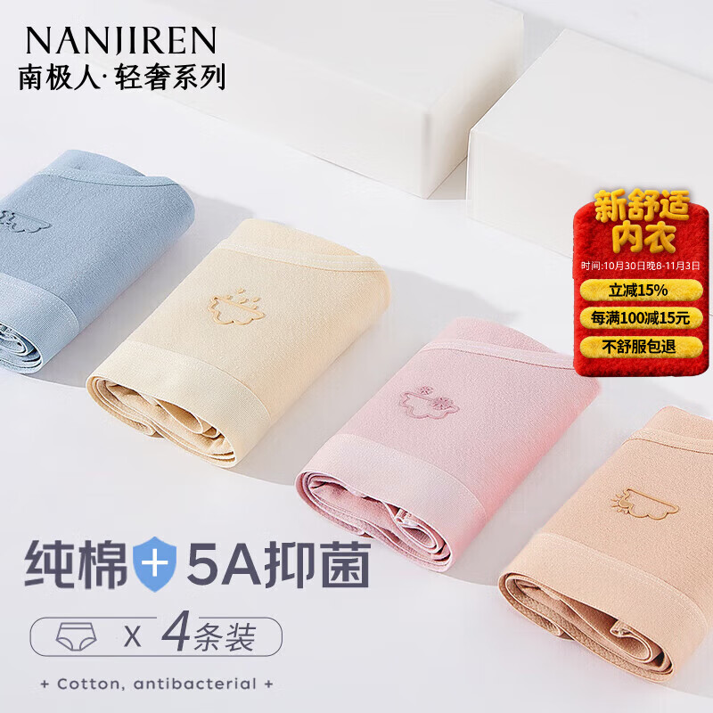南极人4条女士内裤女纯棉100%棉裆5A级抑菌无痕舒适不夹臀中腰女内裤XL