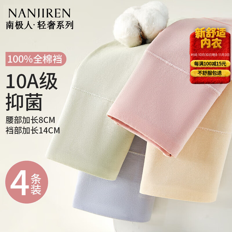 南极人女士内裤女高腰纯棉裆内裤简约三角裤收腹舒适透气4条装