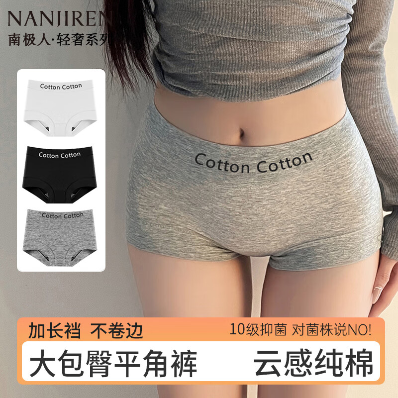 南极人女士内裤女夏季纯棉10A抗菌平角裤女生安全裤大码透气运动风短裤 【奶白+花灰+黑色】- 3条 XL 【适合120-140斤】