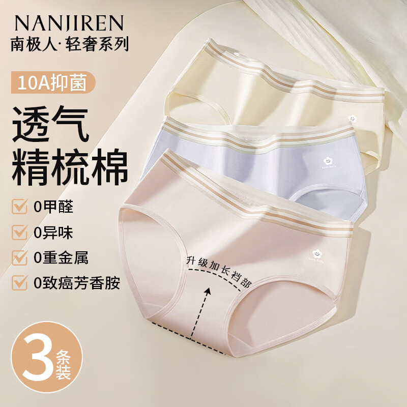 南极人女士内裤女7A抗菌纯棉中高腰短裤夏季加长裆透气女生三角短裤新款 【轻奢系列;独立包装】- 3条 L 【适合100-120斤】