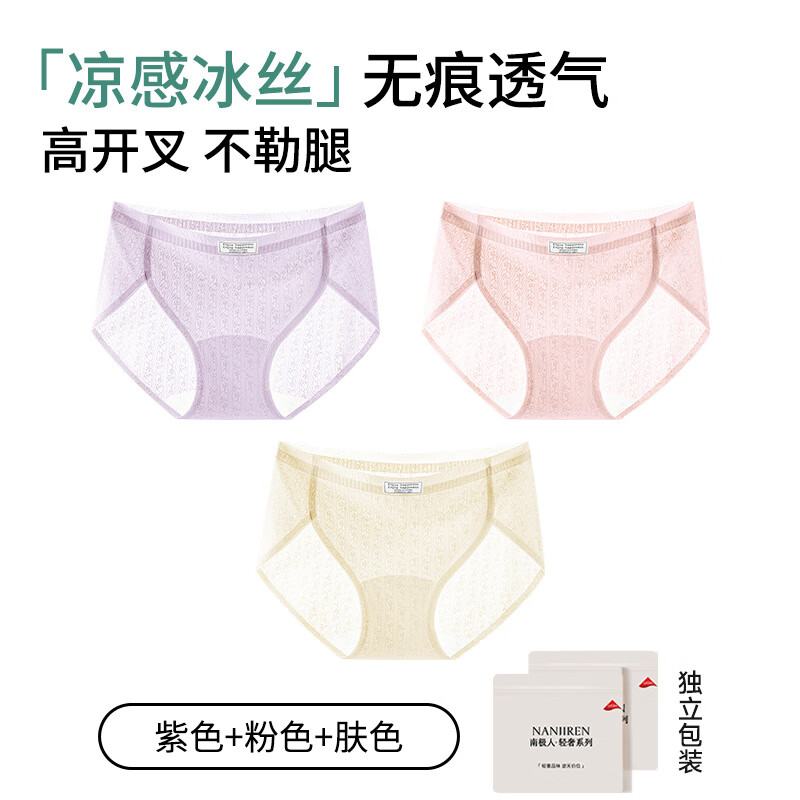 南极人冰丝内裤女士无痕加长裆不夹臀少女生三角短裤2025新款 紫色+粉色+肤色 M