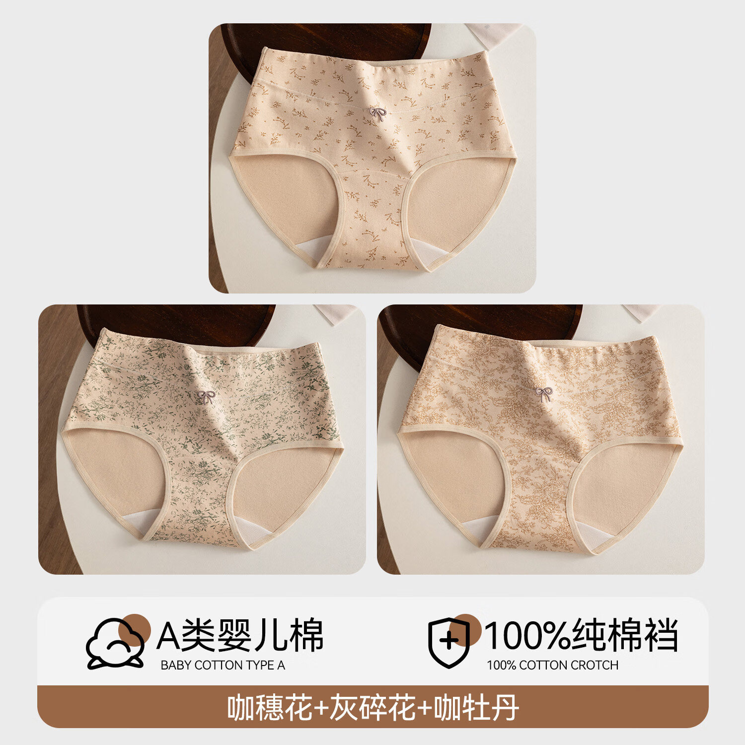 南极人(Nanjiren)内裤女士A类婴儿棉全棉抑菌加长裆包臀碎花女生三角短裤大码 【咖穗花+灰碎花+咖牡丹】 袋装 3条 L 【推荐 100-120斤】