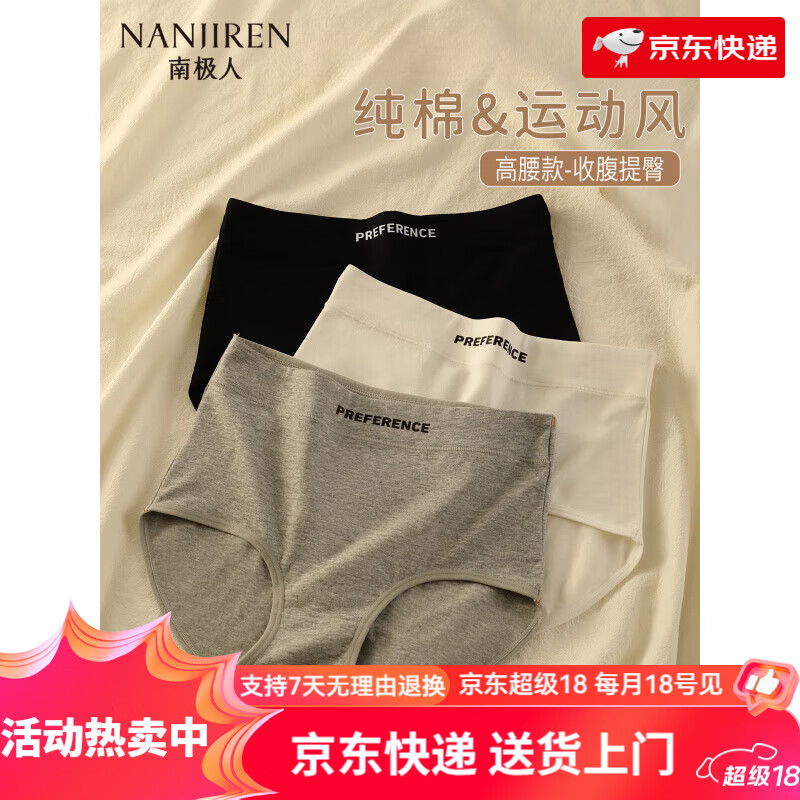 南极人(Nanjiren)女士内裤高腰收腹提臀全棉裆大码女生运动风三角裤 灰色+灰色+黑色 3条 M _【适合80-100斤】