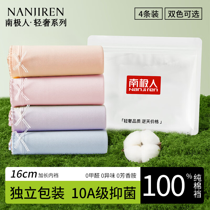 南极人(Nanjiren)女士内裤女100%纯棉10A抑菌加长裆中腰女生三角裤独立包装4条XL