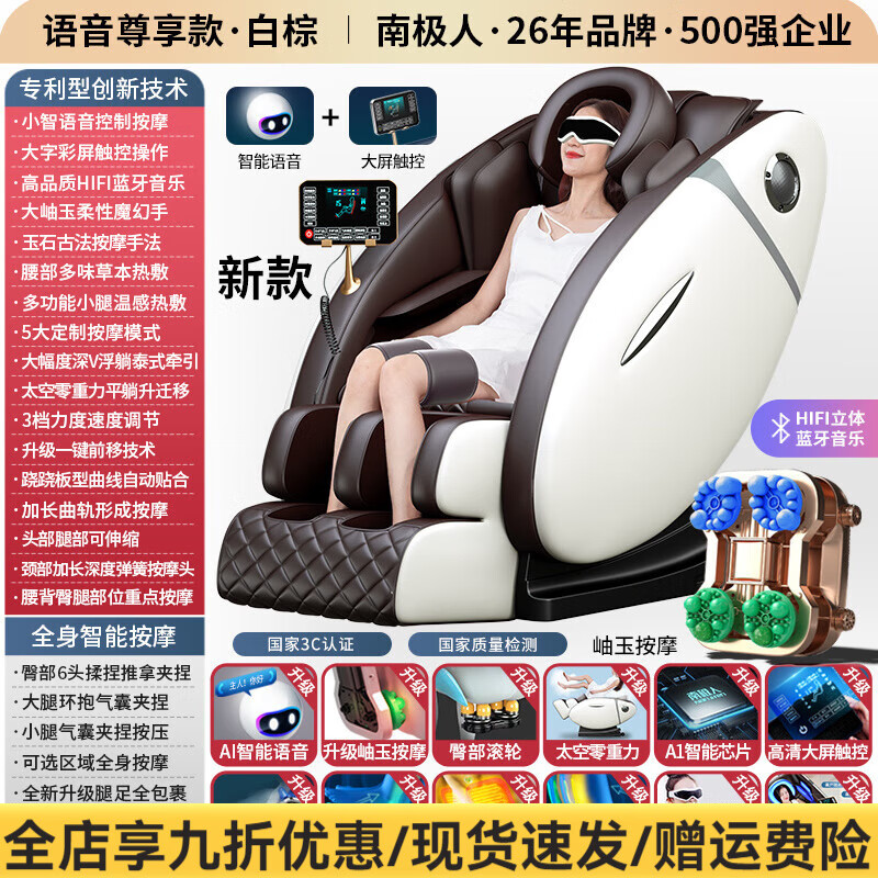南极人(Nanjiren)按摩椅家用全身自动推拿揉捏多功能太空舱中老年沙发按摩器 满配尊享款+AI语音+玉石机芯(白棕)