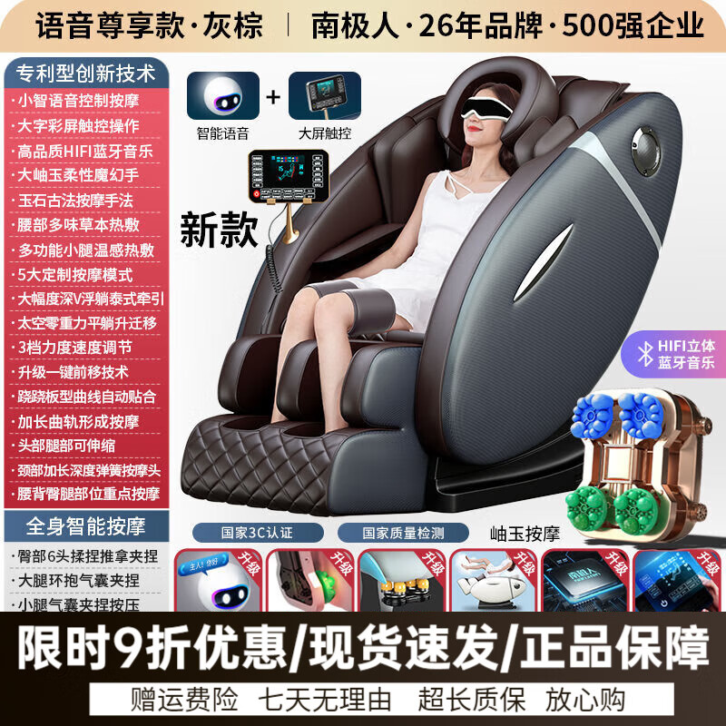 南极人(Nanjiren)按摩椅家用全身自动推拿揉捏多功能太空舱中老年沙发按摩器 满配尊享款+AI语音+玉石机芯(灰棕)
