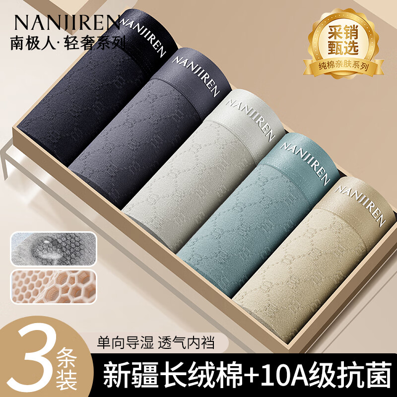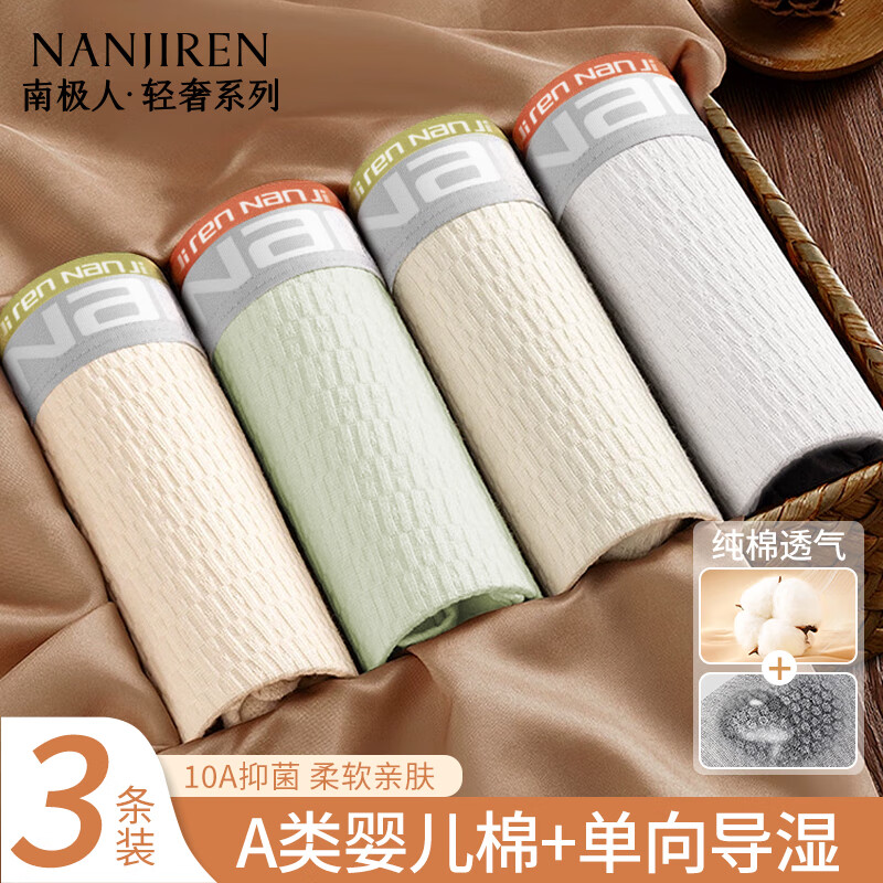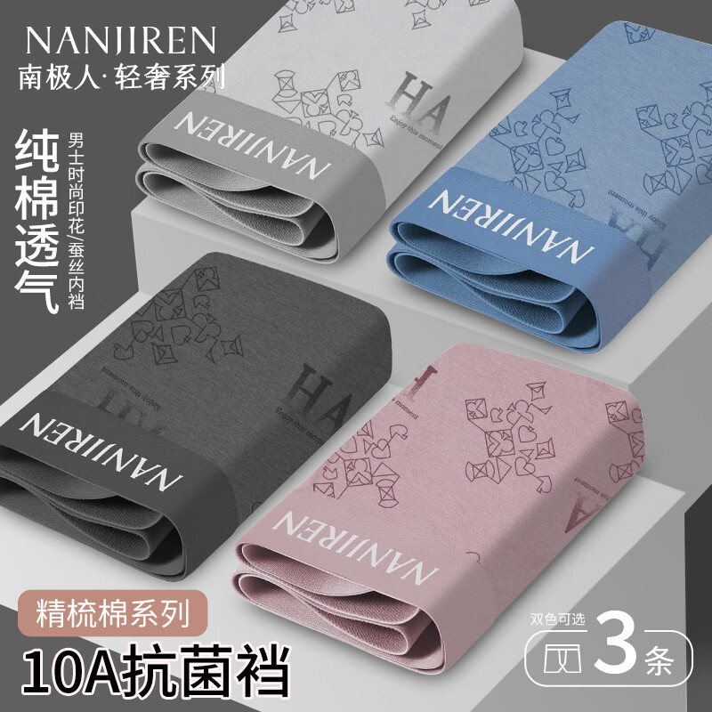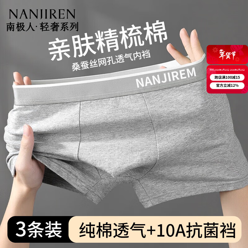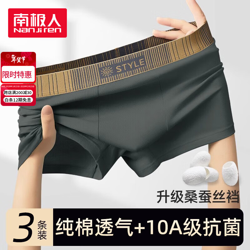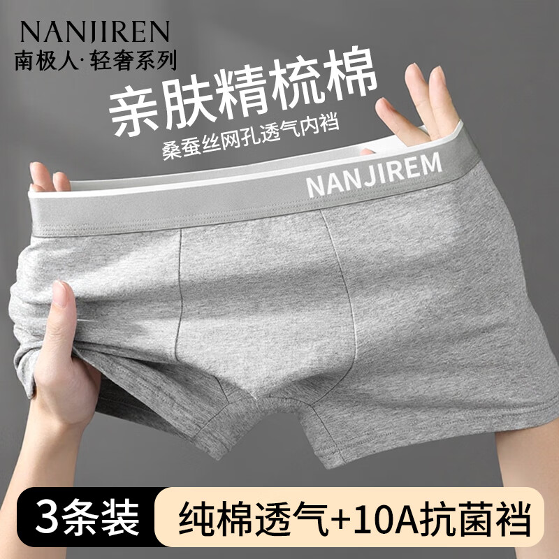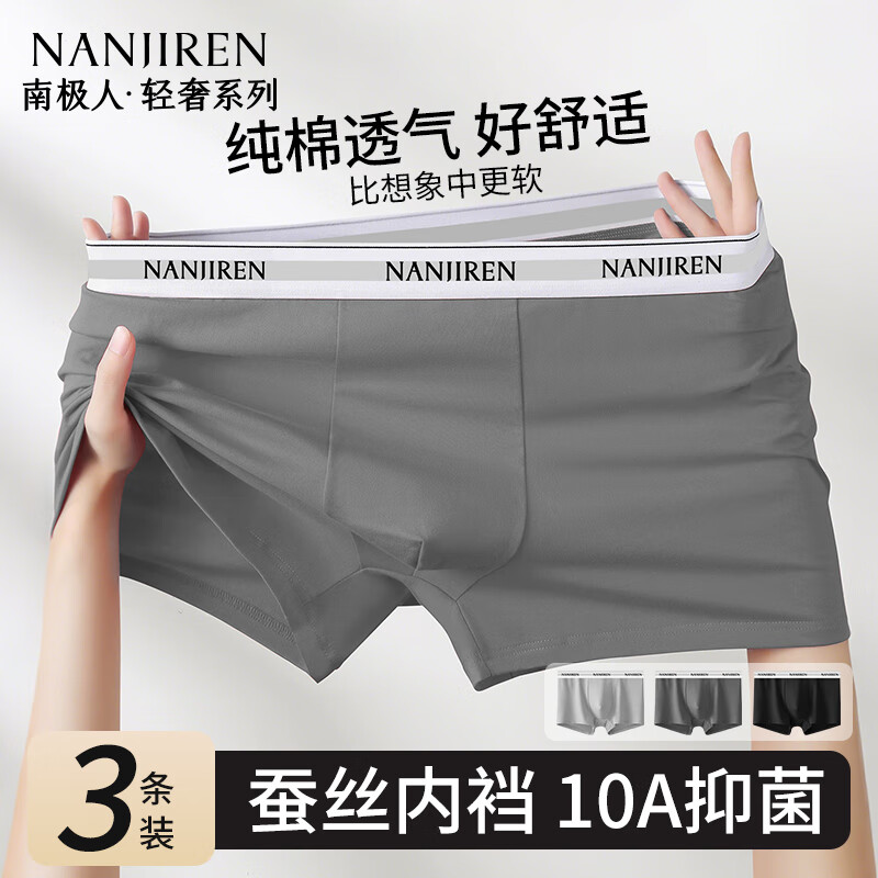 南极人男士内裤男纯棉10A抗菌含蚕丝平角新款男生四角短裤头3条XL