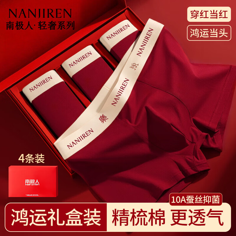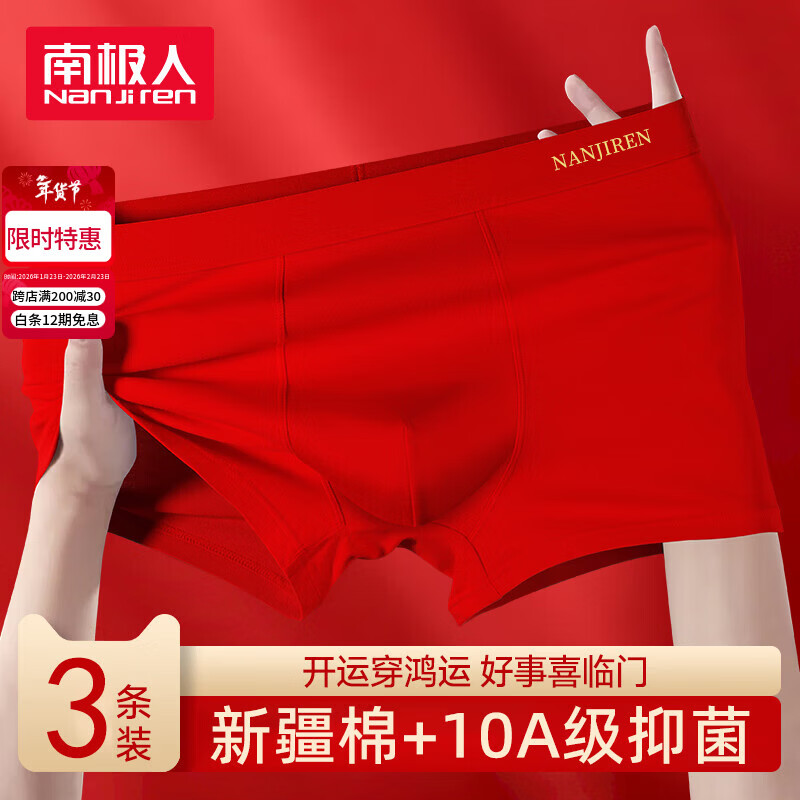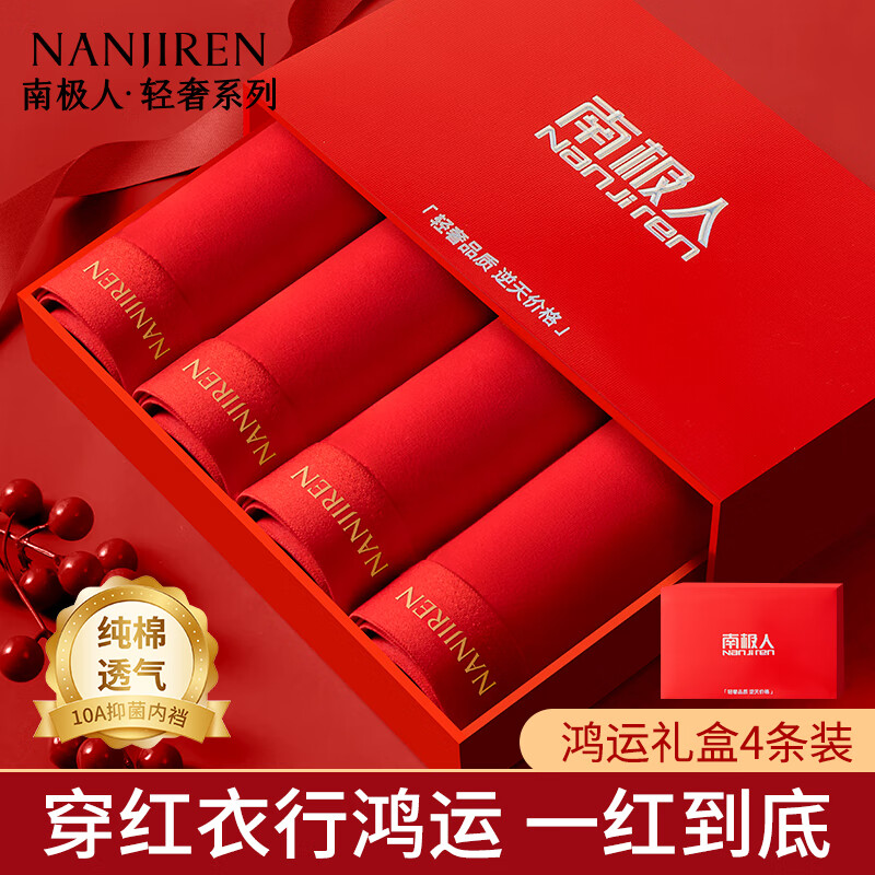 南极人(Nanjiren)内裤男纯棉男士内裤【10A抗菌】本命年红色结婚礼物高端男短裤头
