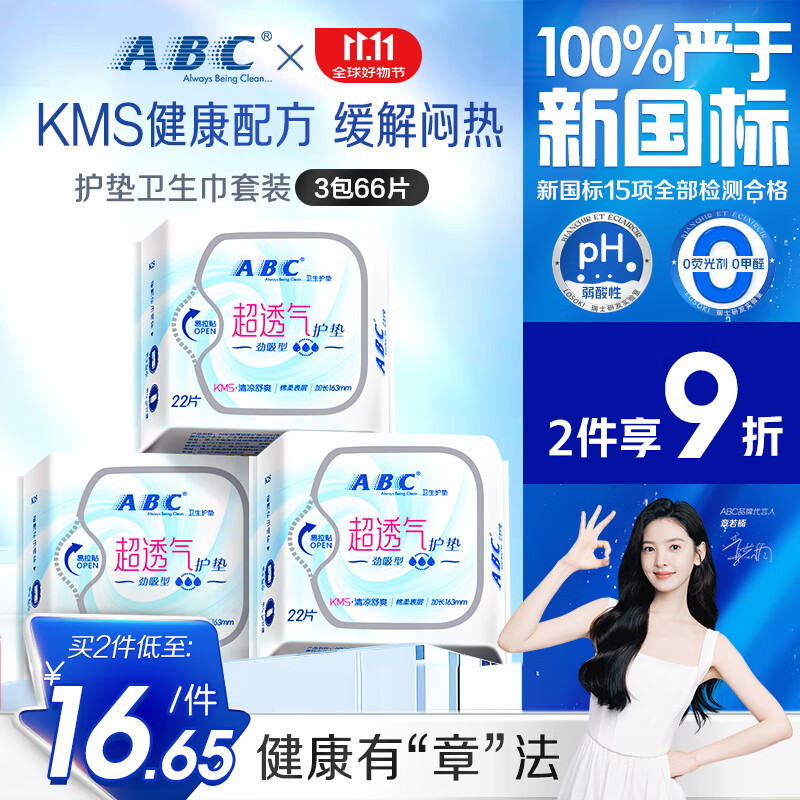 ABCKMS纤薄健康配方超薄透气护垫卫生巾套装京东自营163mm*66片