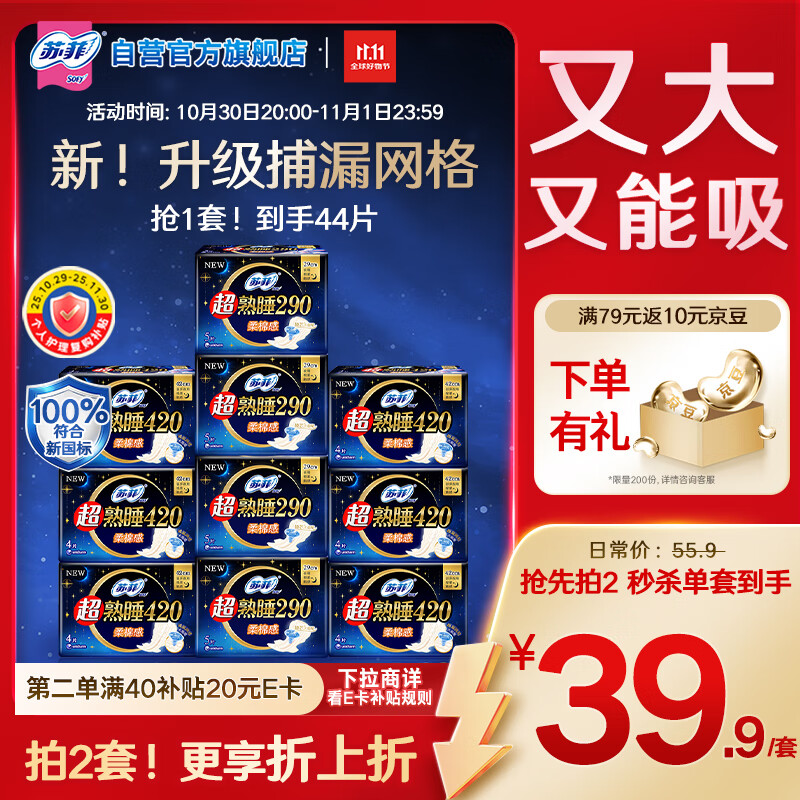 苏菲超熟睡柔棉感夜用卫生巾29cm20片+42cm24片姨妈巾自营旗舰