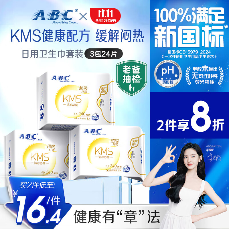 ABCKMS纤薄健康配方超薄透气日用卫生巾套装京东自营240mm*24片