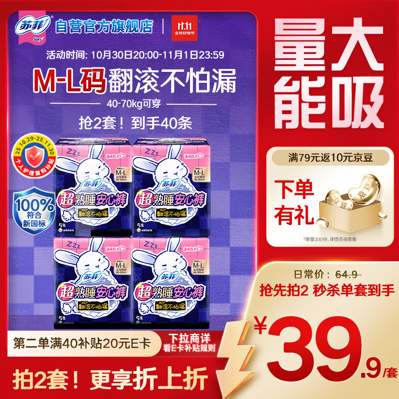 苏菲超熟睡兔子安心裤卫生巾M~L码不勒肚20条安睡裤超薄夜用京东自营