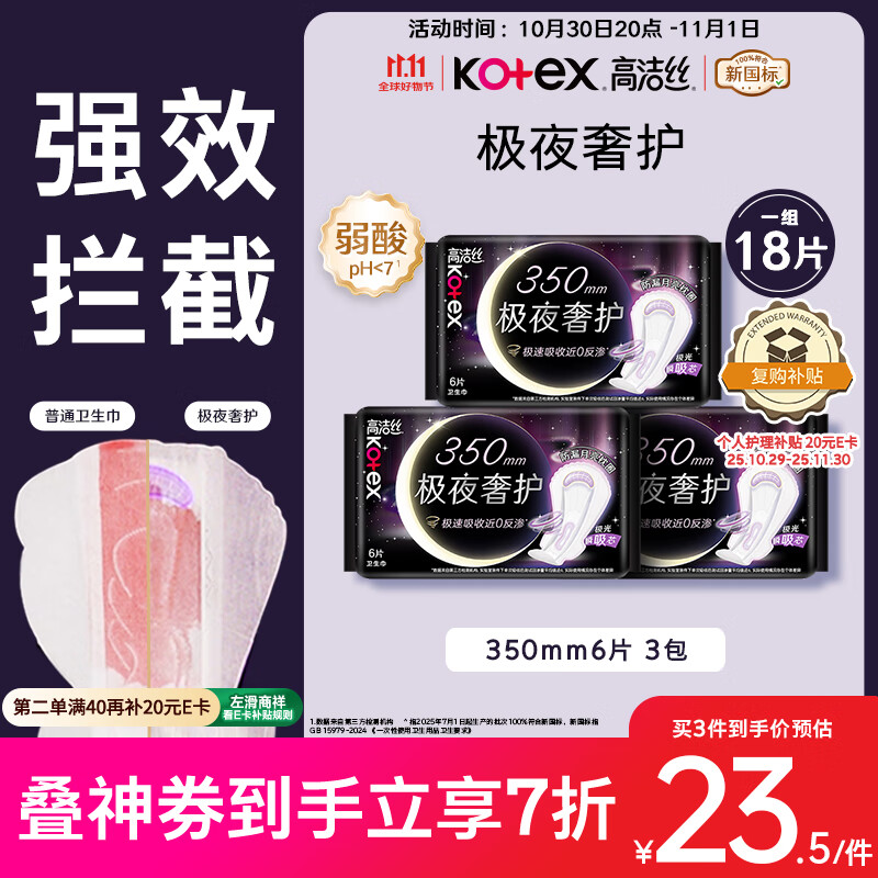 高洁丝【防漏专护】极夜奢护卫生巾350mm6片*3包超长夜用京东自营旗舰