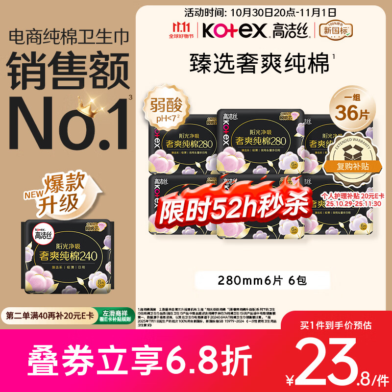 高洁丝【纯棉NO.1】臻选奢爽卫生巾280mm36片日用姨妈巾京东自营旗舰店