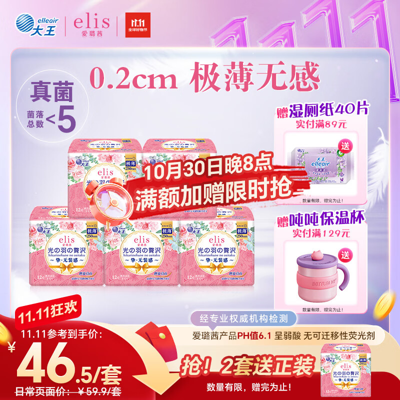 爱璐茜(elis)大王光羽奢适日用卫生巾京东自营250mm60片极薄姨妈巾京东自营