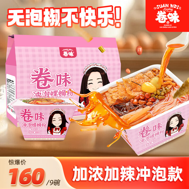卷味 广西柳州特色螺蛳粉冲泡型即食300g*9碗装礼盒网红螺蛳粉 1箱粉色加辣冲泡螺蛳粉