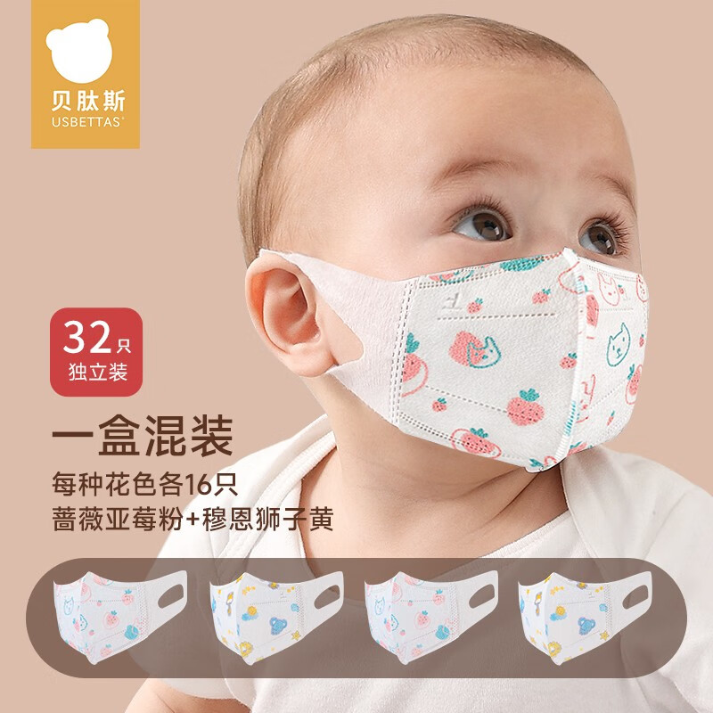 贝肽斯儿童口罩婴儿口罩一次性3D立体防护防尘透气口罩独立包装 蔷薇+狮子 1盒混装(32只) M码 3-6岁(独立包装)