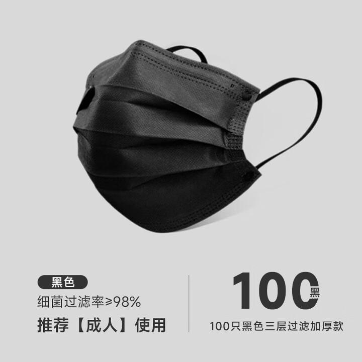 康诺迩一次性防护口罩三层透气云感贴合防风防尘防细菌成人通用 【三层加厚】100只黑色
