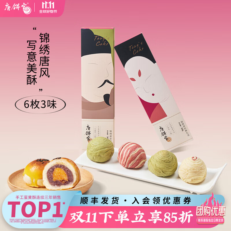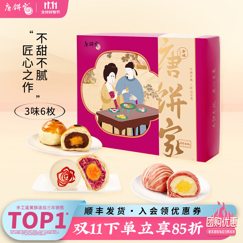 唐饼家手工蛋黄酥礼盒主播推荐送礼红豆芝士小吃下午茶上海特产伴手礼 唐彩酥唐帝款60g*6枚(3口味)