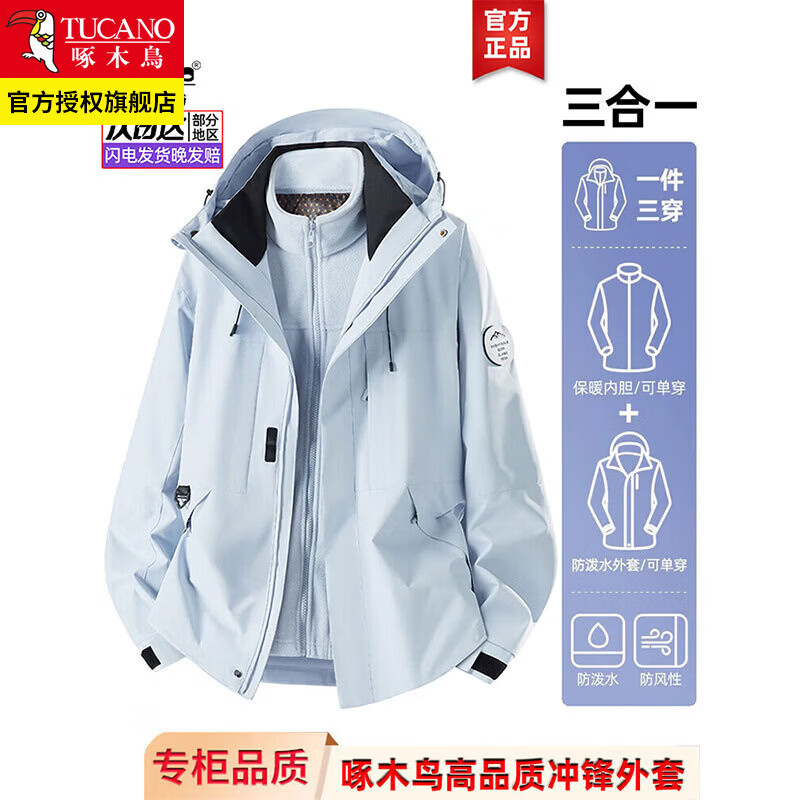 啄木鸟冲锋衣三合一男女士新款春秋冬季外套情侣夹克登山服滑雪衣服男装 月光蓝 (三合一男女同款) M 【建议100-120斤】
