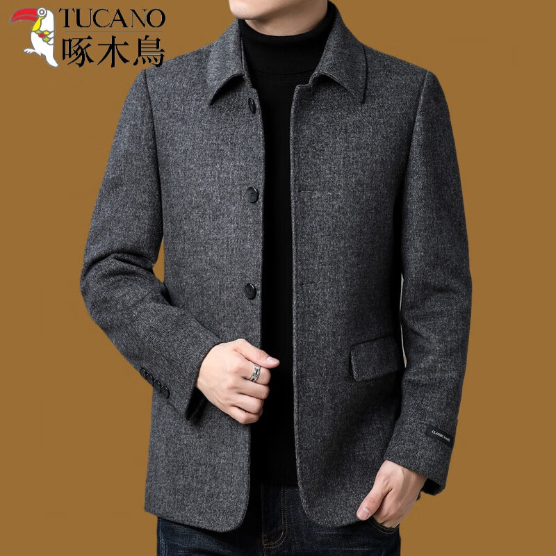 啄木鸟高端双面羊绒大衣男短款中年商务休闲翻领男装加厚羊毛呢子外套潮 93313 灰色 XL