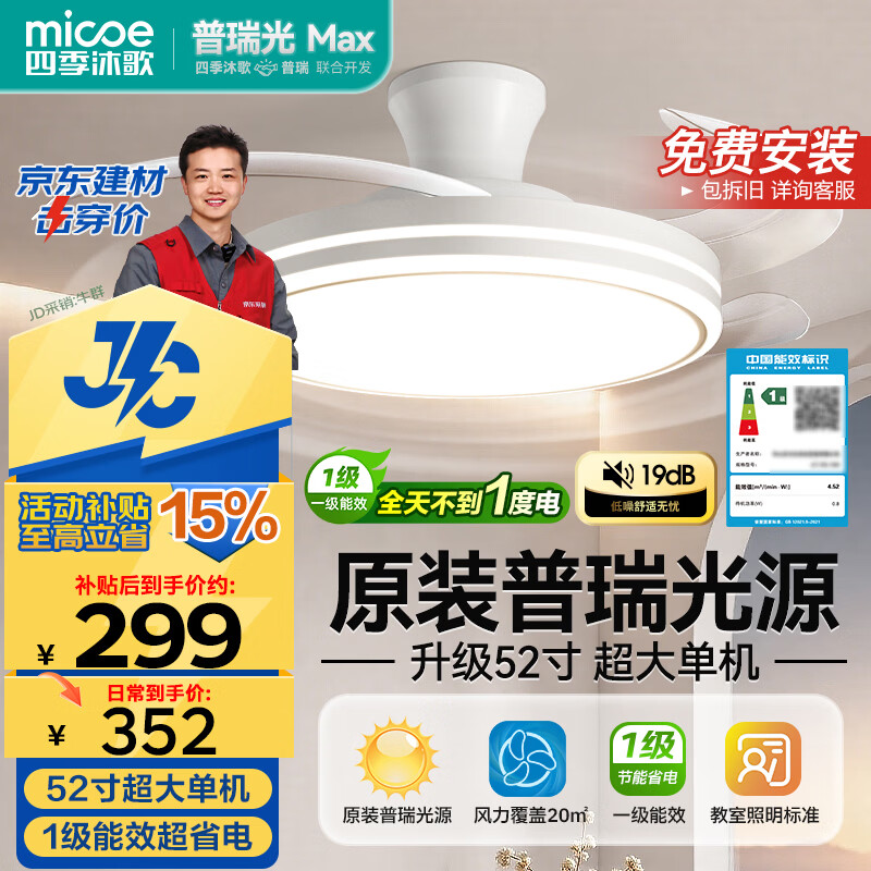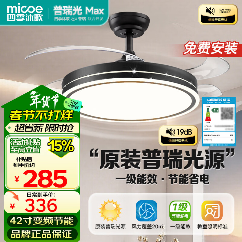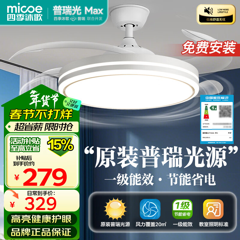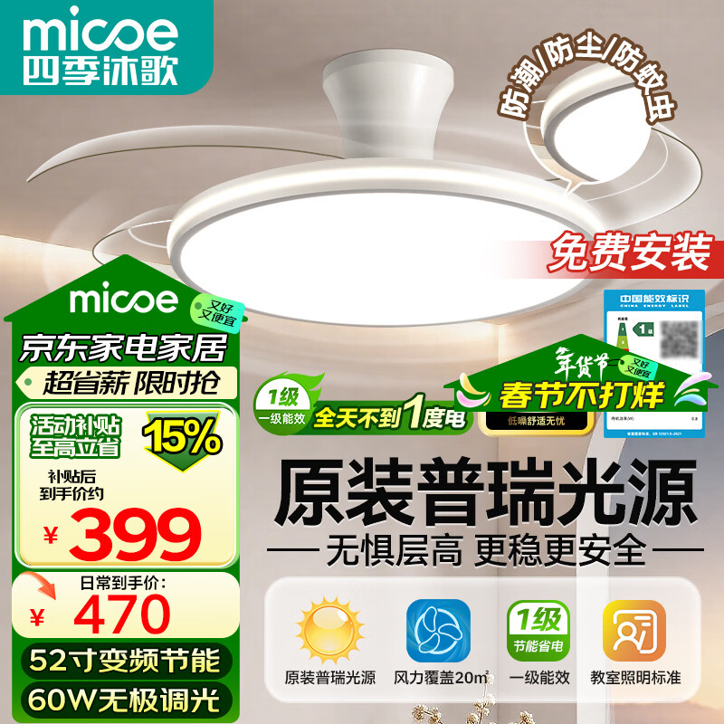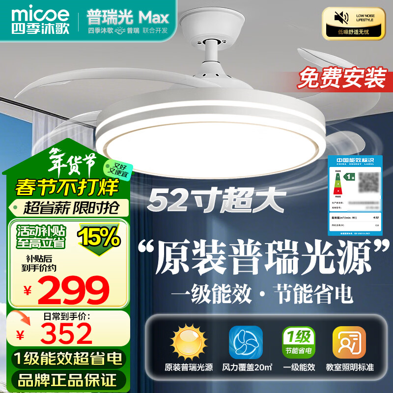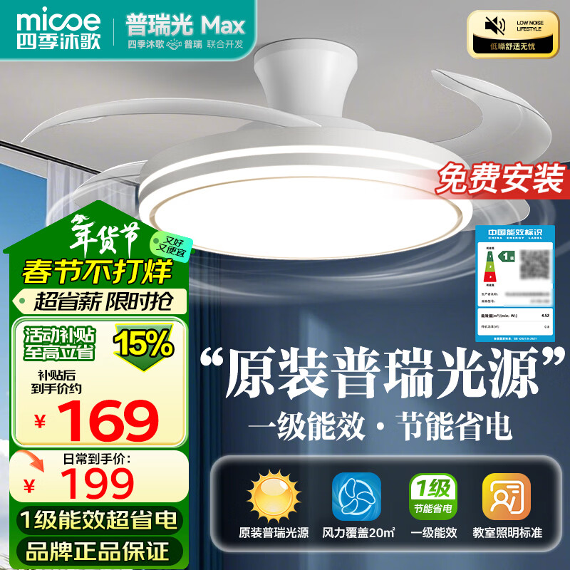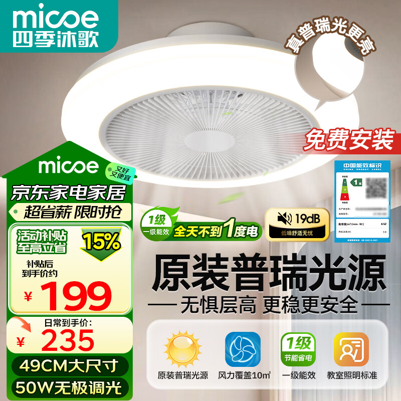 四季沐歌(MICOE)吊扇灯风扇灯具客厅餐厅卧室简约普瑞光源LED隐形吊扇灯