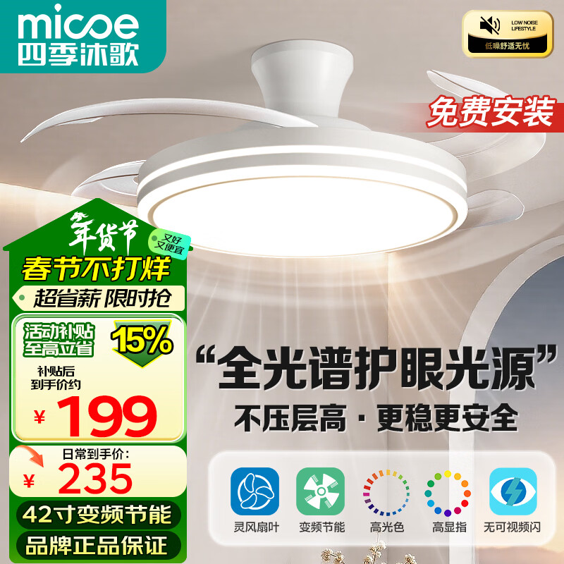 四季沐歌(MICOE)吊扇灯风扇灯具客厅北欧餐厅卧室简约LED隐形吊扇灯现代包安装