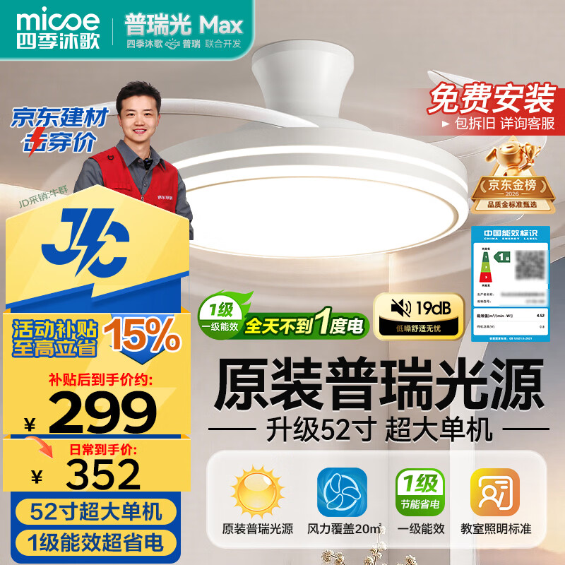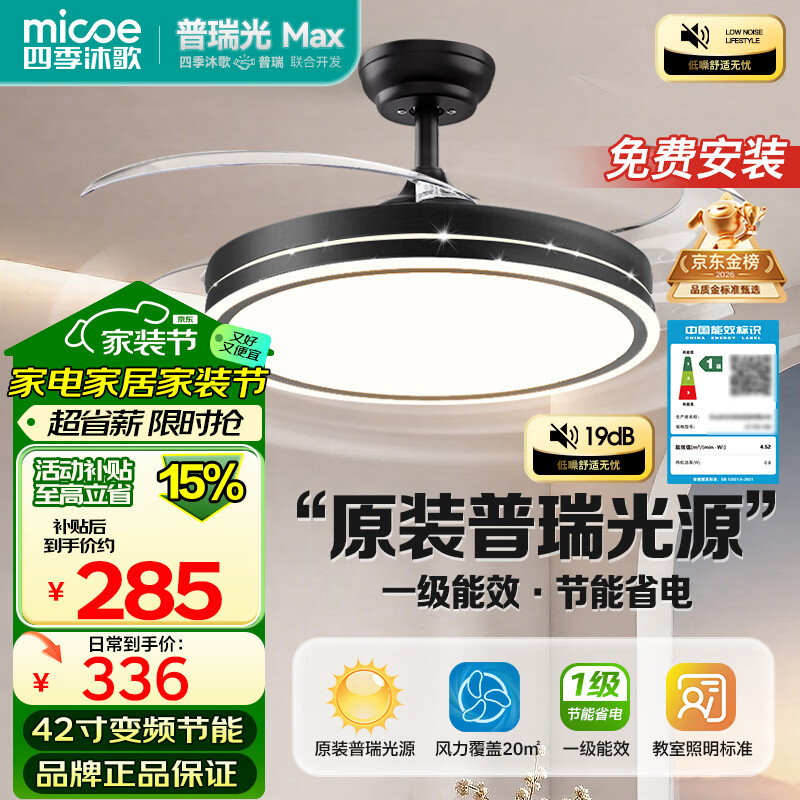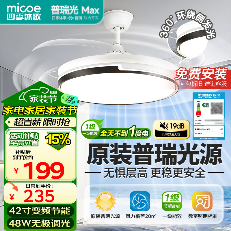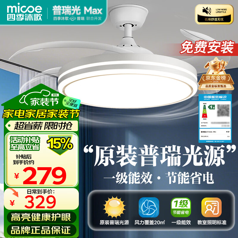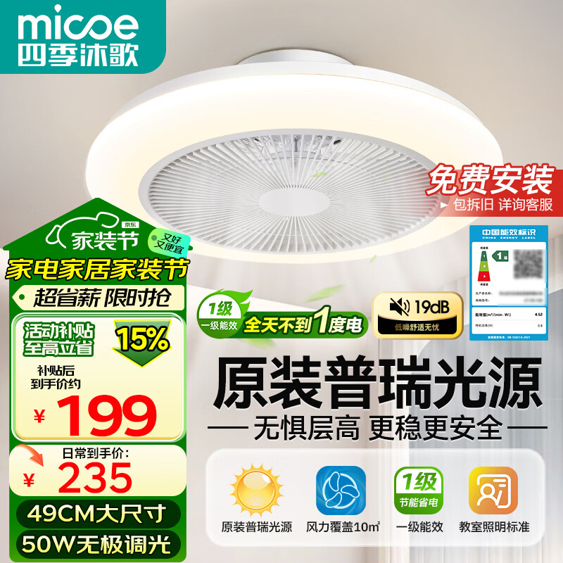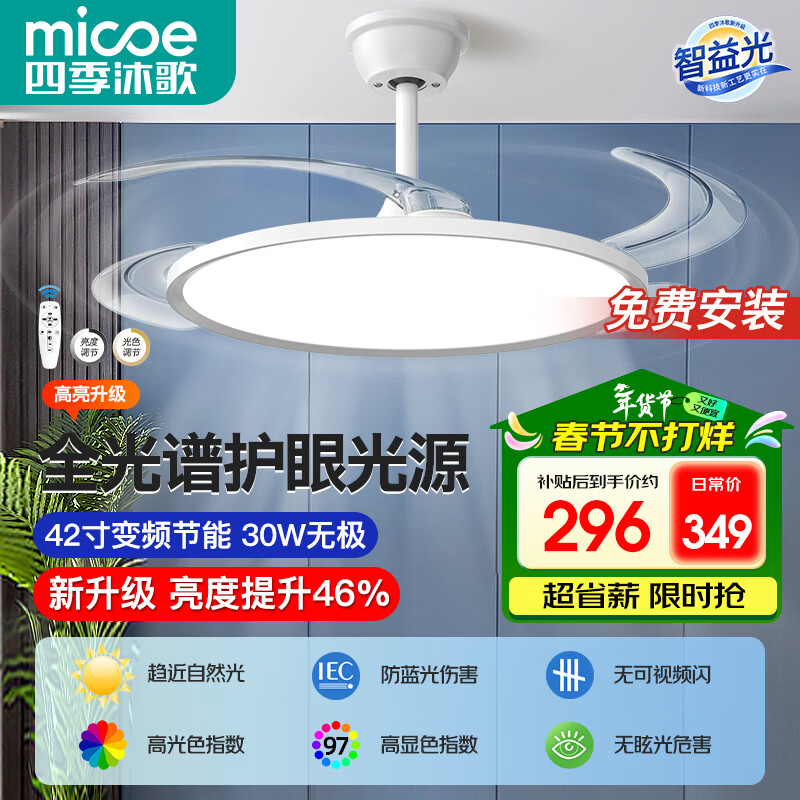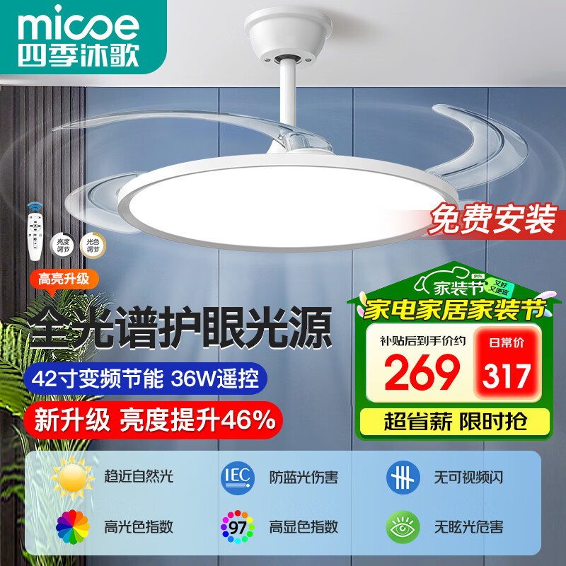 四季沐歌(MICOE)京东京采风扇灯全光谱护眼LED隐形扇叶餐厅遥控调光一体吊扇灯