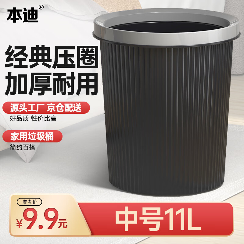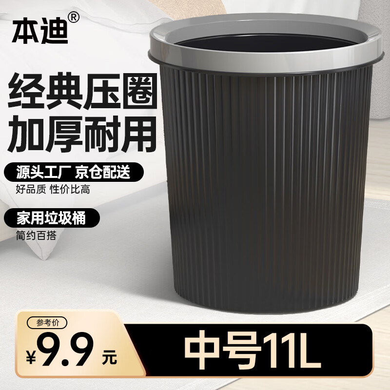 本迪压圈垃圾桶11L加厚大容量黑色桶身家用厨房厕所办公宿舍保洁纸篓