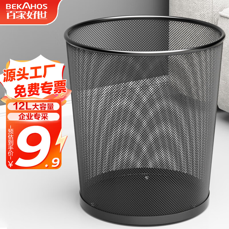 百家好世 家用金属网垃圾桶无盖12L圆形黑色客厅卫生间卧室铁丝网办公纸篓