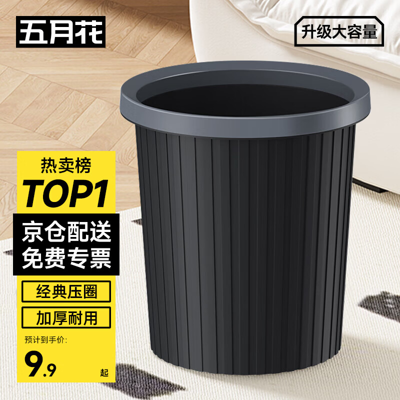 五月花压圈垃圾桶直投11L大容量黑色加厚桶身家用厨房厕所办公宿舍纸篓