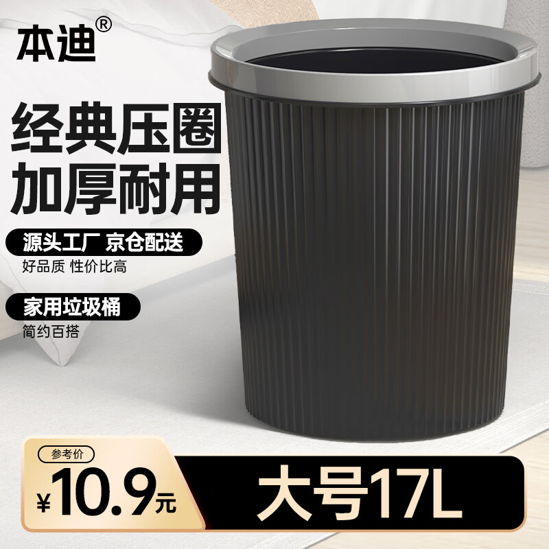 本迪压圈垃圾桶17L大号厨房客厅家用卫生间垃圾桶办公室宿舍纸篓