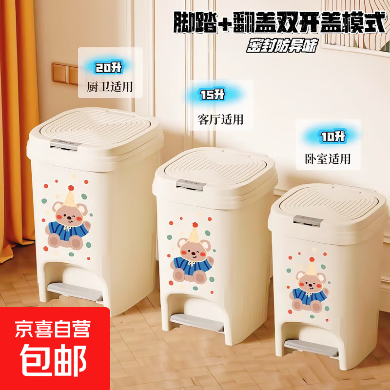 家用脚踏按压垃圾桶大容量厨房厨余桶卧室卫生间客厅带盖密封纸篓 脚踏双开方桶-抱抱熊-10L