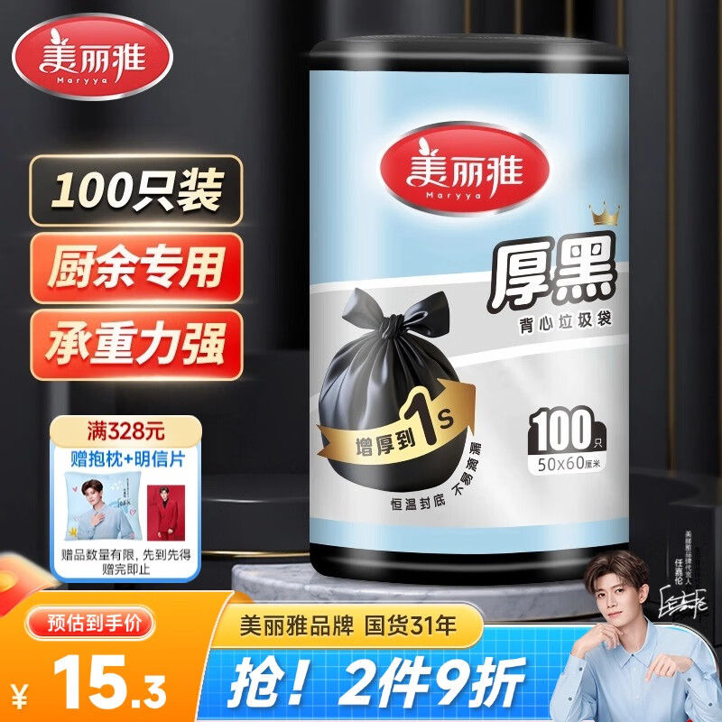 美丽雅背心垃圾袋黑色大号50*60cm100只1丝点断式加厚厨房家用垃圾袋