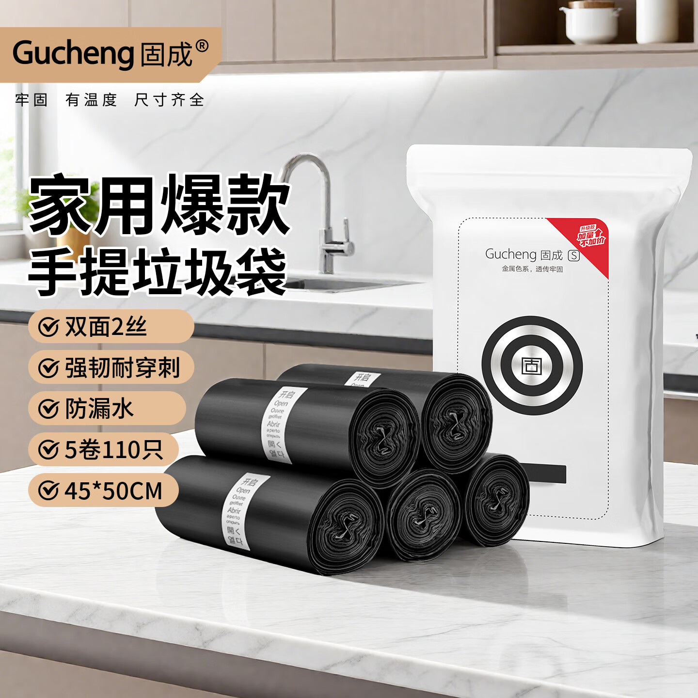 利得抽绳垃圾袋黑金印花45*50cm100只单面1丝免撕印花加厚厨房垃圾袋