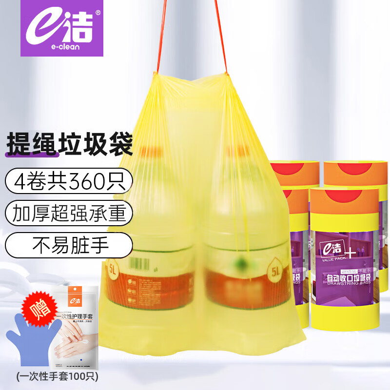 e洁 抽绳垃圾袋黄色45*50cm4卷共360只单面1丝点断家用手提垃圾袋