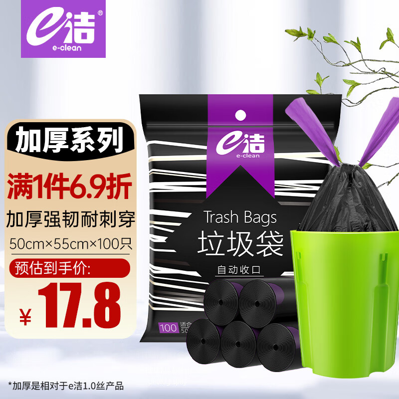e洁抽绳垃圾袋黑色50*55cm100只单面1.3丝家用手提穿绳免撕加厚
