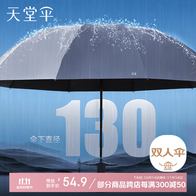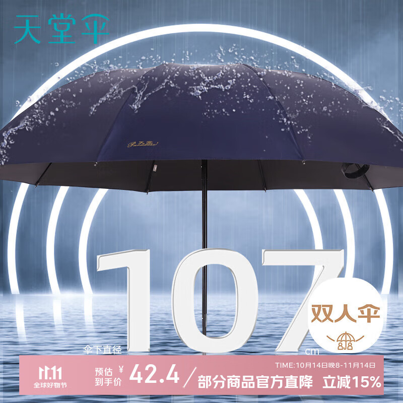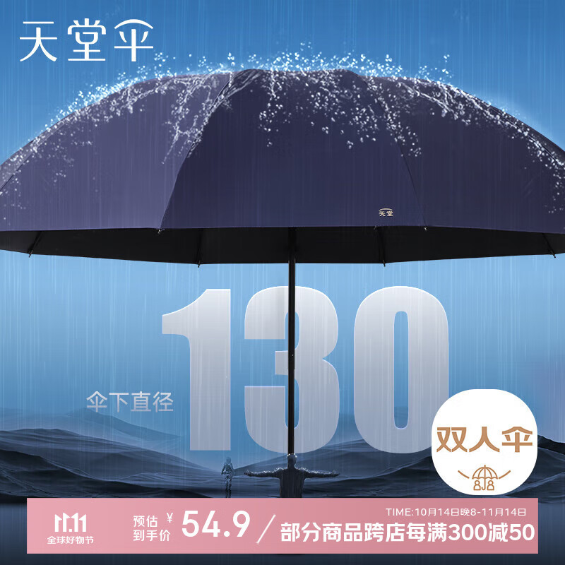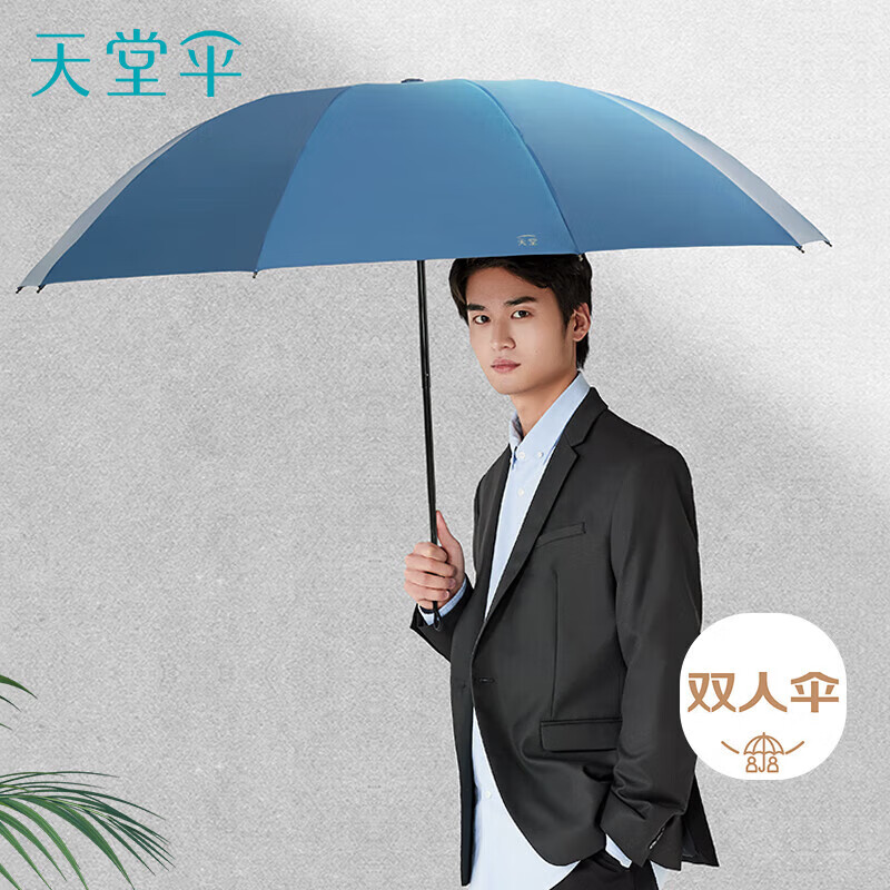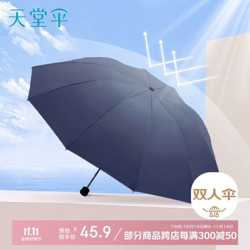 天堂 双人晴雨伞三折 晴雨伞三折10骨超大加固黑胶防晒伞 深邃蓝