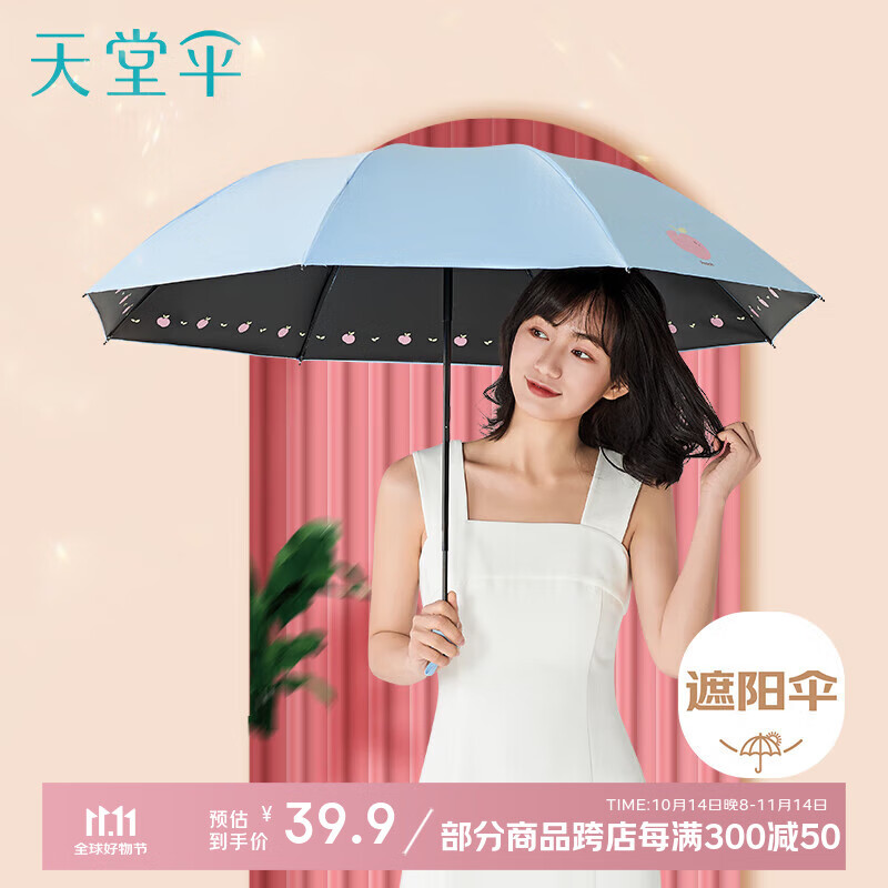 天堂 防紫外线阳伞三折 遮阳伞黑胶防晒伞蜜桃图案晴雨伞 浅兰