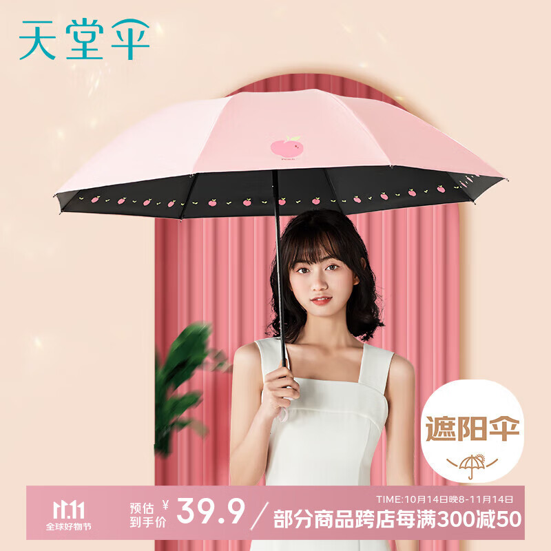 天堂 防紫外线阳伞三折 遮阳伞黑胶防晒伞蜜桃图案晴雨伞 粉色