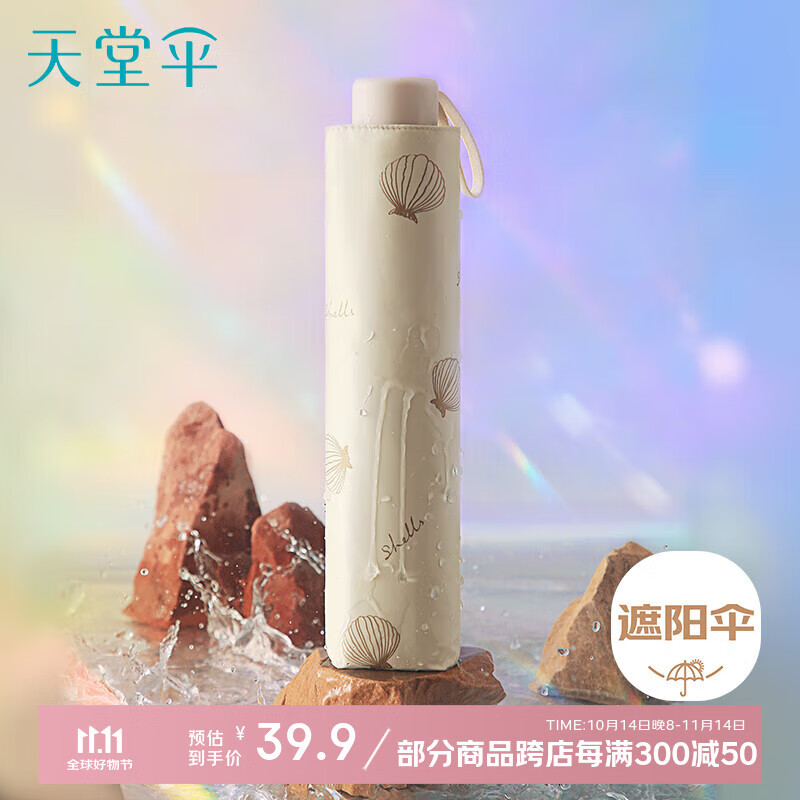天堂 防晒阳伞三折 遮阳伞黑胶防晒伞贝壳图案三折叠晴雨伞 甘酪白
