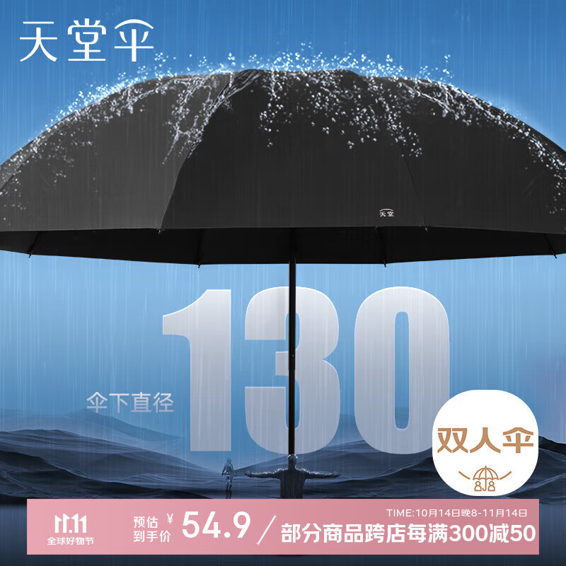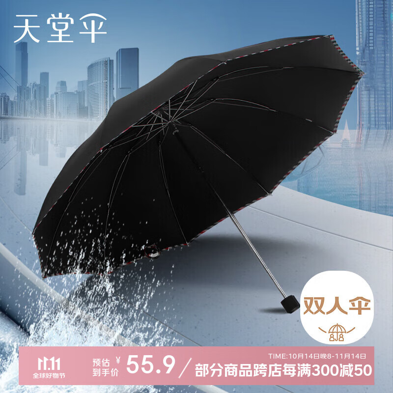 天堂 双人晴雨伞三折 晴雨伞三折10骨超大加固黑胶防晒伞 曜石黑