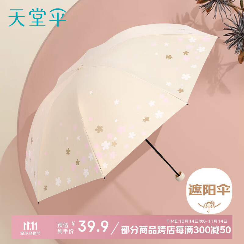 天堂 防紫外线阳伞三折 遮阳伞三折印花晴雨伞黑胶防晒太阳伞 米色