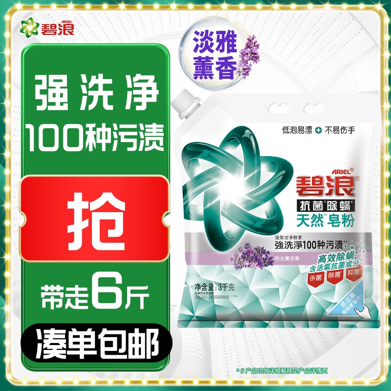 碧浪抗菌除螨洗衣天然皂粉薰衣草香6斤装 温和无刺激 低泡易漂