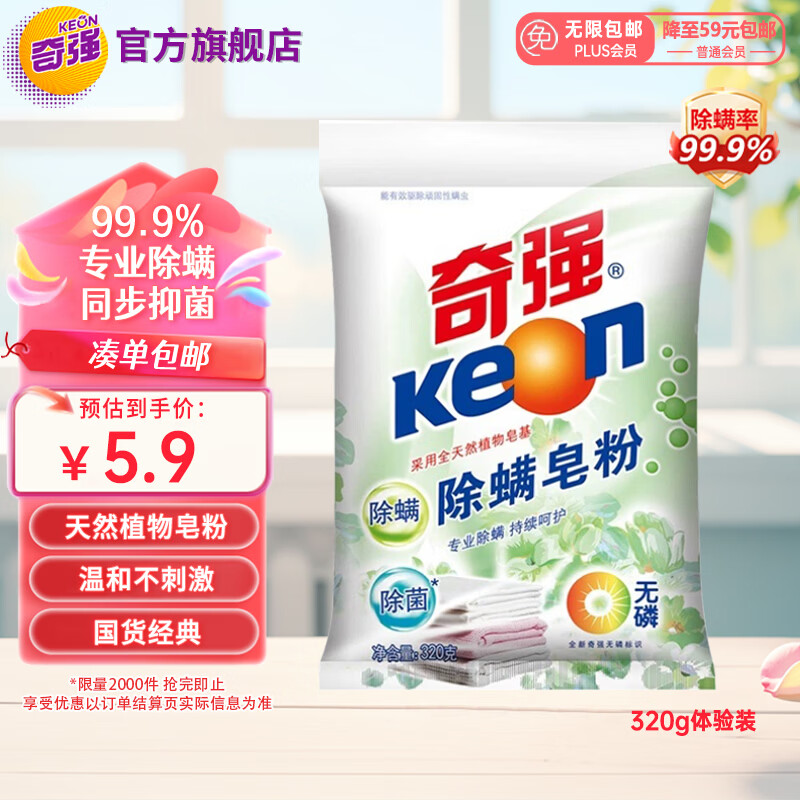 奇强除螨抑菌天然植物洗衣皂粉320g学生小袋袜子护衣去渍家庭洗护清洁