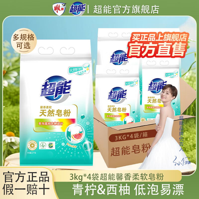 超能天然皂粉家用实惠装馨香柔软高档衣物低泡易漂洗衣粉官方正品官旗 【24斤】3kg*4袋超能皂粉