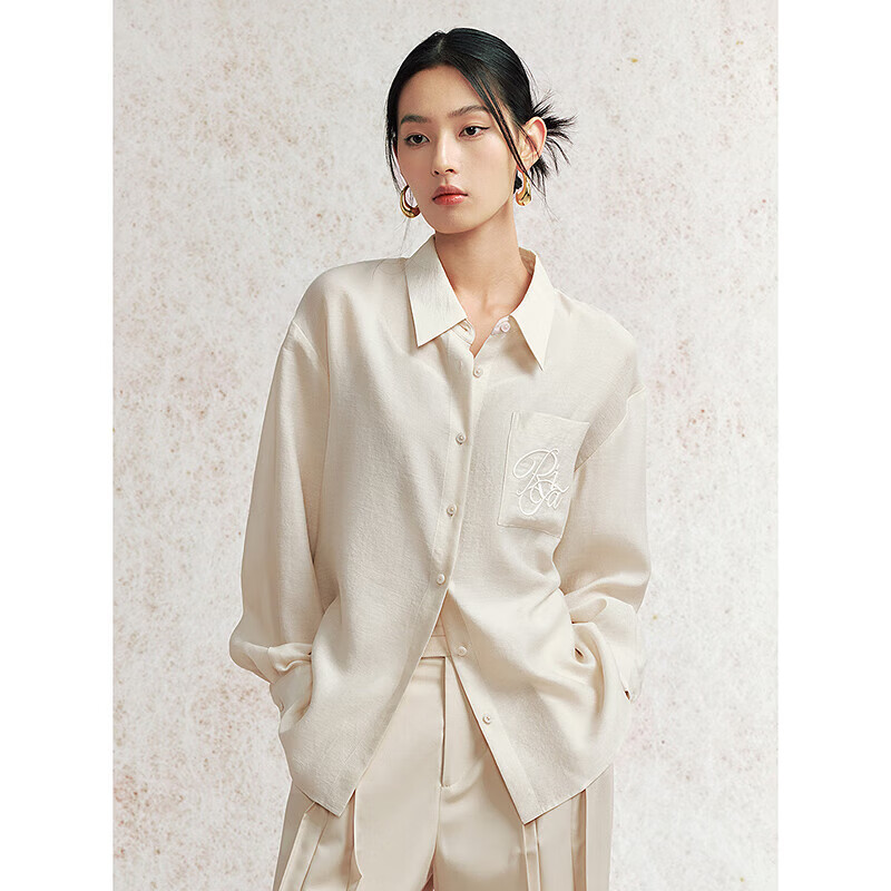 太平鸟女装国风莱赛尔品质衬衫夏季立体刺绣后背开叉衬衣套装 米色衬衫 M